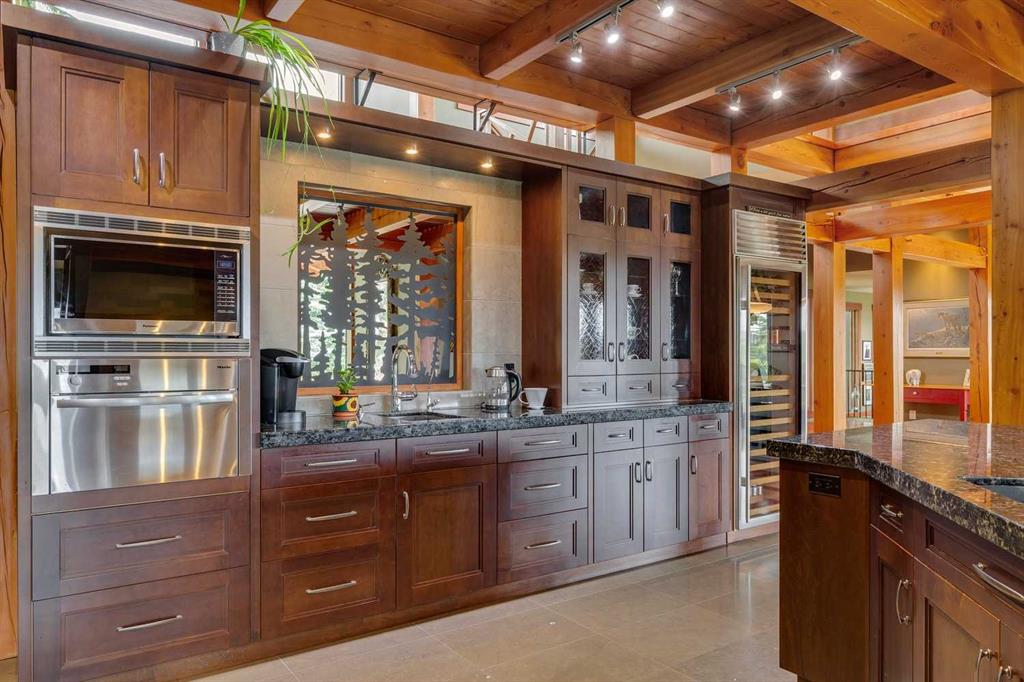 Nestled in picturesque Priddis, this exceptional Craftsman style bungalow epitomizes luxurious living, showcasing bespoke finishes at every corner and spectacular woodland views of its 9.51 acres with the towering Rockies in the distance. Despite its palatial size, the rooms exude warmth and intimacy, perfect for family gatherings, grand celebrations or corporate retreats. Upon stepping through the stunning 9-foot solid wood doors with forged iron handles, a tantalizing glimpse of the impeccable artisanal workmanship is revealed. Entertain with grace in the dining room beneath vaulted ceilings and surrounded by fir columns, framed by the breathtaking mountain backdrop. A stunning double-sided limestone fireplace graces the living room, offering panoramic views. On the opposite side of the fireplace is the kitchen, making this area of the home the natural gathering space. This culinary haven boasts state-of-the-art appliances by SubZero, Miele and Viking including a steam oven, wine fridge and 6-burner gas range, tailor-made wood cabinets with a glass fronted display hutch, copper hood fan, granite counters, and secondary prep sink. The expansive curved island invites lively conversations while prepping gourmet meals. An office/den with double doors, huge windows overlooking the pines and a stone feature wall provides a quiet work space. Down the hall is the serene primary bedroom, a luxurious retreat featuring another double-sided fireplace, a sitting area and a vaulted ceiling. Delight in moments of tranquility on the balcony adjoining the the spa-like ensuite, savouring morning coffee amidst nature’s beauty. A large walk-in closet is divided into two spaces and contains its own washer/dryer. The custom designed staircase is an architectural marvel that leads you to a sunlit loft with a 360 degree view of the property and surrounding forest. Descend to the lower walk-out level to discover a lavish entertainment haven, boasting a sleek wet bar, a movie theatre, games area, cozy family room, and three additional bedrooms accompanied by two well-appointed bathrooms, redefining leisure and relaxation. A bonus room above the attached 4-car garage provides an area for your hobbies or additional living space. You will also find a separate carriage house complete with its own entrance, kitchen, living room, and two bedrooms with ensuites on this floor, making it ideal for guests or live-in caretakers. Step outside to experience unparalleled outdoor living, where a sprawling deck spans the entire rear facade, complete with a gas fireplace for enchanting evenings. A charming wooden pergola stands ready to embrace balmy summer nights, and the fire pit offers an idyllic vantage point to witness the sunset painting the sky over the beautiful Rocky Mountains. Additional features include a fenced garden with raised beds, a barn with two stalls and a tack room constructed with reclaimed wood from a nearby historic building, and a heated workshop with a storage mezzanine.