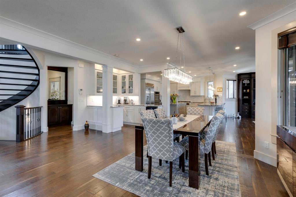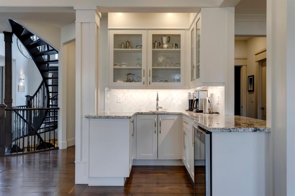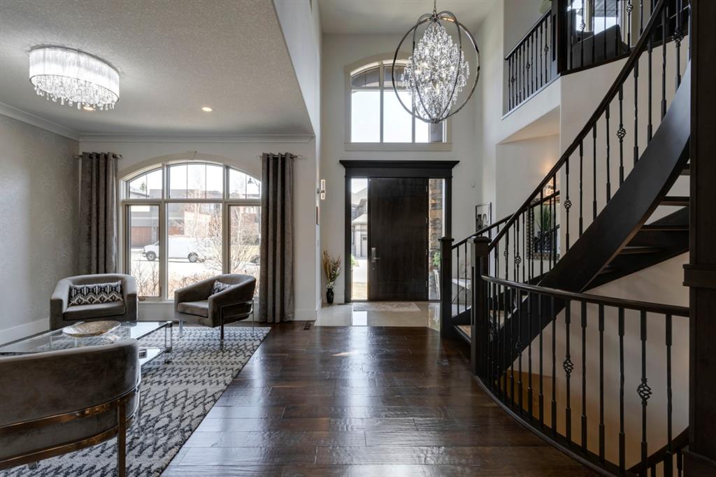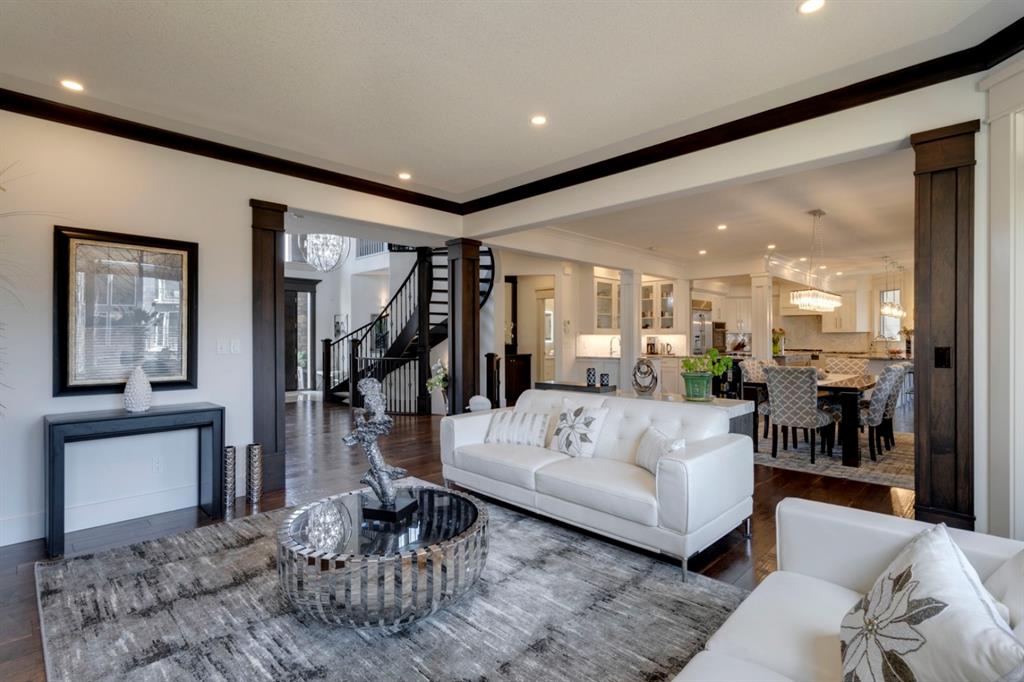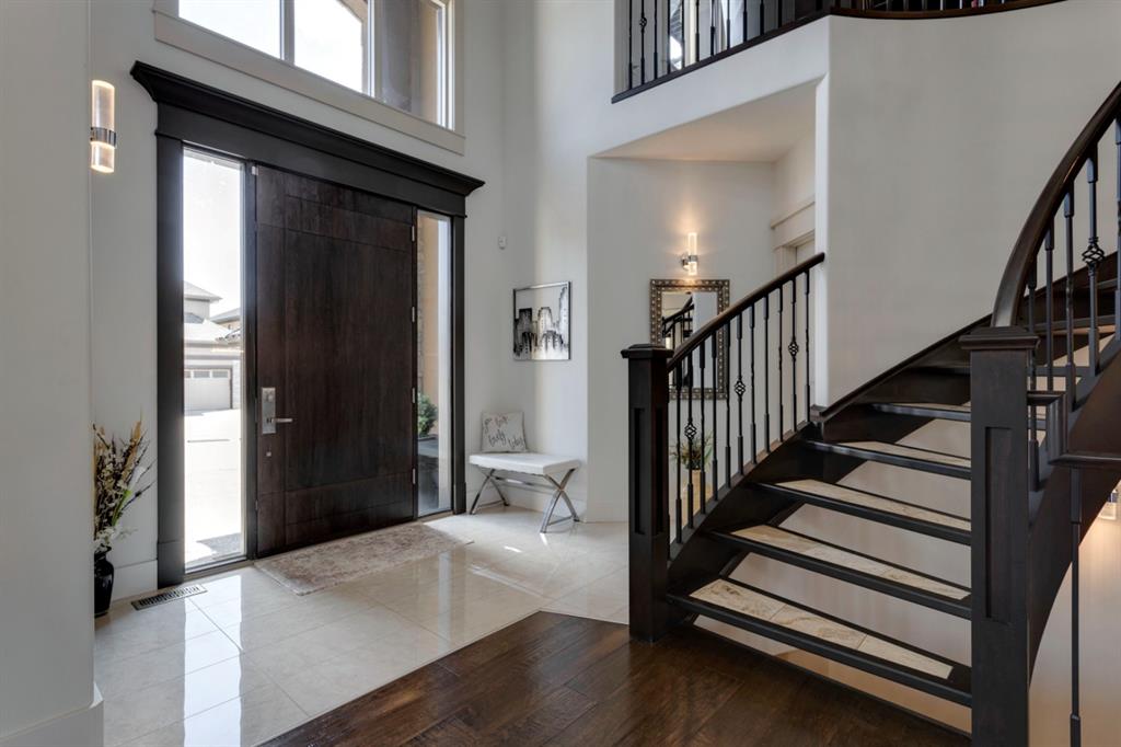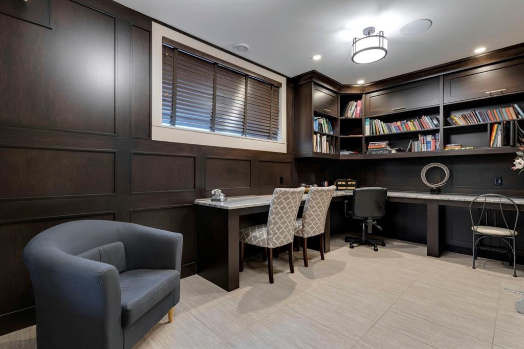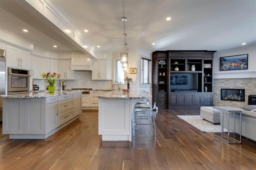 No need to start the car…the kids can walk to Rundle College, only one block away! Original one-owner home, custom built in the pinnacle of Aspen Woods, in prestigious Aspen Heights. Renovated in 2018 to unveil a modern, open concept main floor design that beckons you into over 6,000 square feet of meticulously finished living space. If you enjoy having a houseful of friends and family, this property is for you. Upon stepping inside, you are greeted by an elegant sitting/conversation room, which can easily be used as a formal dining room, depending on your needs. The living room features a fireplace and doors that open up to the West facing sunroom, extending outdoor living for 3 season enjoyment and offering views of the Rockies. The open concept eating area has a server’s bar, making entertaining a crowd easy. In the chef’s dream kitchen you’ll find granite counters, herringbone backsplash, and high end appliances including a 6-burner gas cooktop and double wall ovens. The convenient laundry/mudroom with walk in panty offers plenty of storage and easy access to the triple heated garage. A three story, spiralling staircase highlighted with inset limestone connects all three levels and meets up with a library on the second floor. French doors lead into the primary suite, which contains a double-sided fireplace, sitting area, walk-in closet and serene ensuite. Four additional bedrooms (one with its own ensuite) are generously sized for kids of all ages. A custom wine cellar with iron doors greets you as you enter the lower heated walk-out level. Work quietly from the home office which features multiple built-in desks and double-sided fireplace. The huge media room and games area provide tons of hang out space for everyone or to host Stanley cup parties. The wet bar is fully equipped with a full-sized Miele fridge, wall oven, microwave, dishwasher and a second wine fridge. Rest assured about any noise concerns – sound baffling has been installed in the ceiling to block the transmission of noise upstairs. Nestled down the hall are the fitness room, and a private 6th bedroom and bathroom clad in Italian marble for your visiting guests. Additional features include a brand new energy efficient hot water tank installed in 2024, hand scraped maple hardwood throughout, and a custom large front door with security locks. The yard has been professionally landscaped, is fully enclosed with fencing, faces west, and has an apple and pear tree. Only 12 minutes to downtown, and minutes to Hwy 1 and the mountains via the new Stoney trail corridor. Rundle College, Ernest Manning and the 69th Street LRT station are just steps away, with markets, shops, and restaurants all within walking distance. This home has it all, and is perfect for your large family gatherings. Oh, and did we mention: a Hallmark movie was filmed in this home (2022) and will be released in 2024.