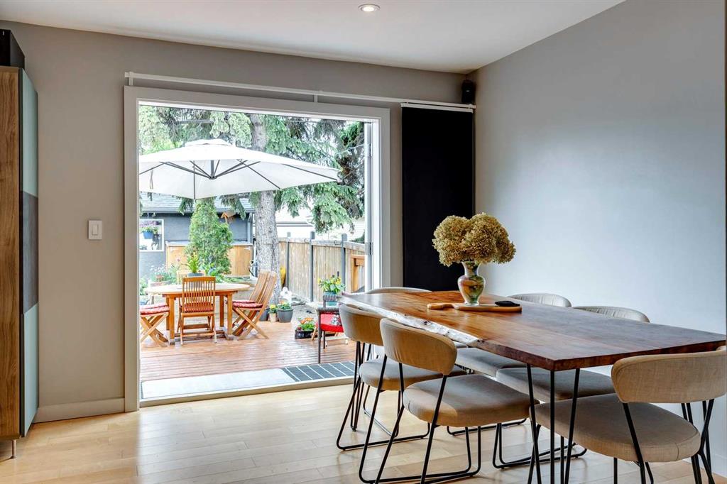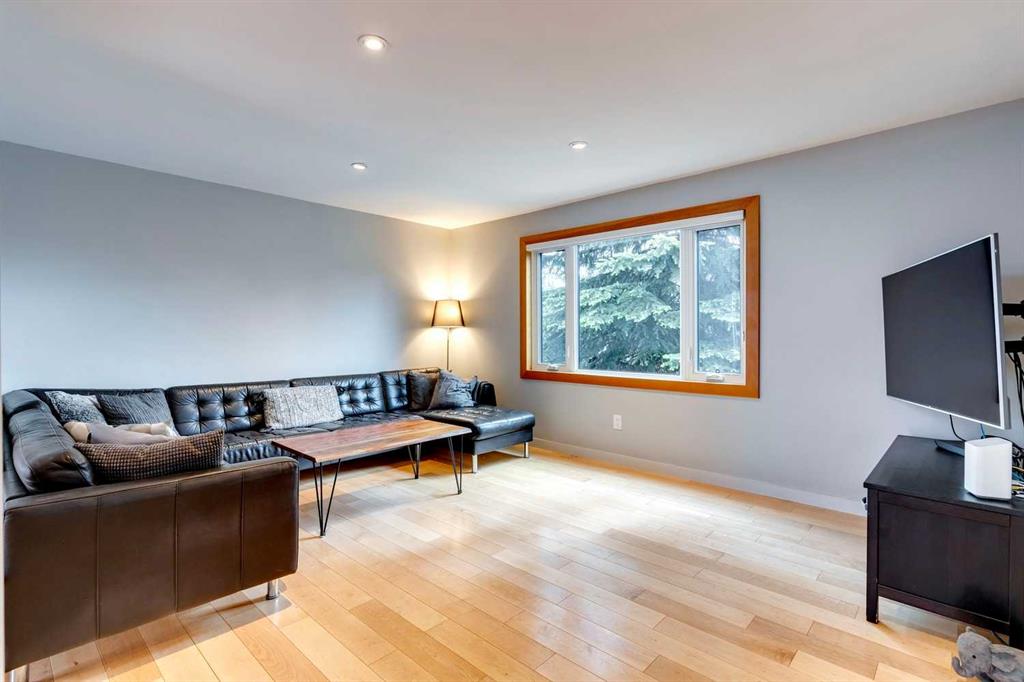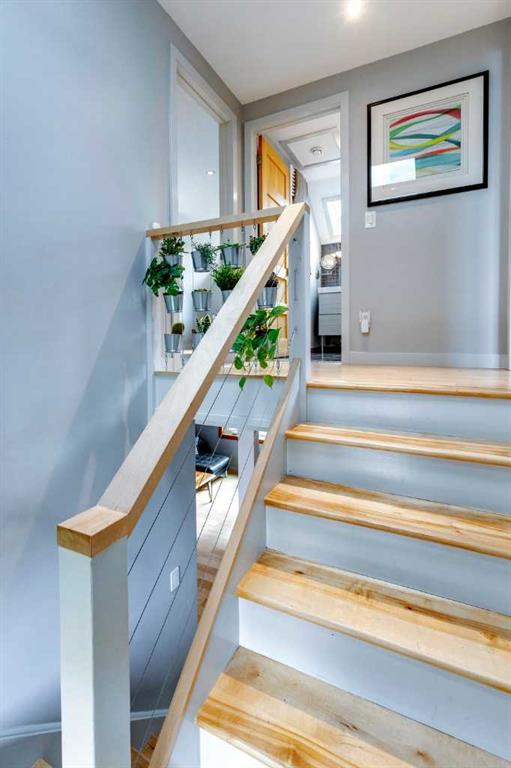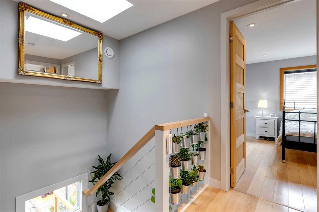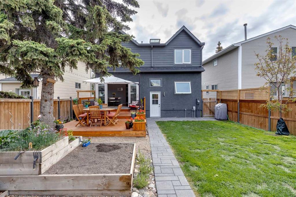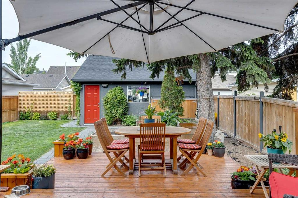 Welcome to this charming, cheerful house located in the popular neighbourhood of Garrison Woods. As you approach, the vibrant red front door immediately catches your eye, inviting you to explore the warmth and comfort within. Ideal for a couple or a small family, this home has a sun-filled, open-concept living room and dining room with doors out to the west-facing deck. The kitchen has been updated with a wood-topped breakfast bar, sleek cabinets, a five-burner stove, and a stainless steel fridge. Upstairs, the second floor has been expanded to include a spacious primary bedroom with dormer windows which flood the room with natural light, and a second bedroom with a large storage closet. In between is a renovated bathroom complete with modern finishes, a skylight, and heated towel rack. The fully developed basement is a versatile space with wood floors, offering a recreation room for entertainment and relaxation. Additionally, it houses two extra bedrooms and a laundry room, providing ample space for various needs. One of the standout features of this property is its expansive and sunny yard. Complete with a deck, lush lawn, raised garden beds, and mature trees, it offers a perfect outdoor oasis for relaxation, gardening, and play. Additional features include a double detached garage with a rough-in for a 220V outlet, a parking pad, a gas hookup for the BBQ, a VFR ventilation system in the roof and a hydraulic heating system. The neighbourhood of Garrison Woods is highly sought after for its abundance of parks, proximity to Marda Loop with its boutiques and eateries, excellent schools, and easy access to downtown and Mount Royal University. Flanders Park and playground are just a short stroll away, and you can enjoy a treat at the nearby ice cream shop or explore the scenic pathways of River Park on your bike. Don’t miss the opportunity to make this charming and cozy house your own and experience the vibrant lifestyle offered by Garrison Woods.