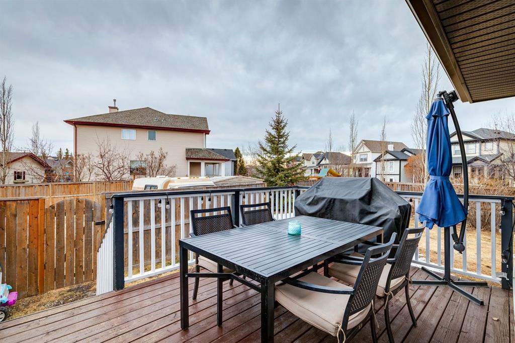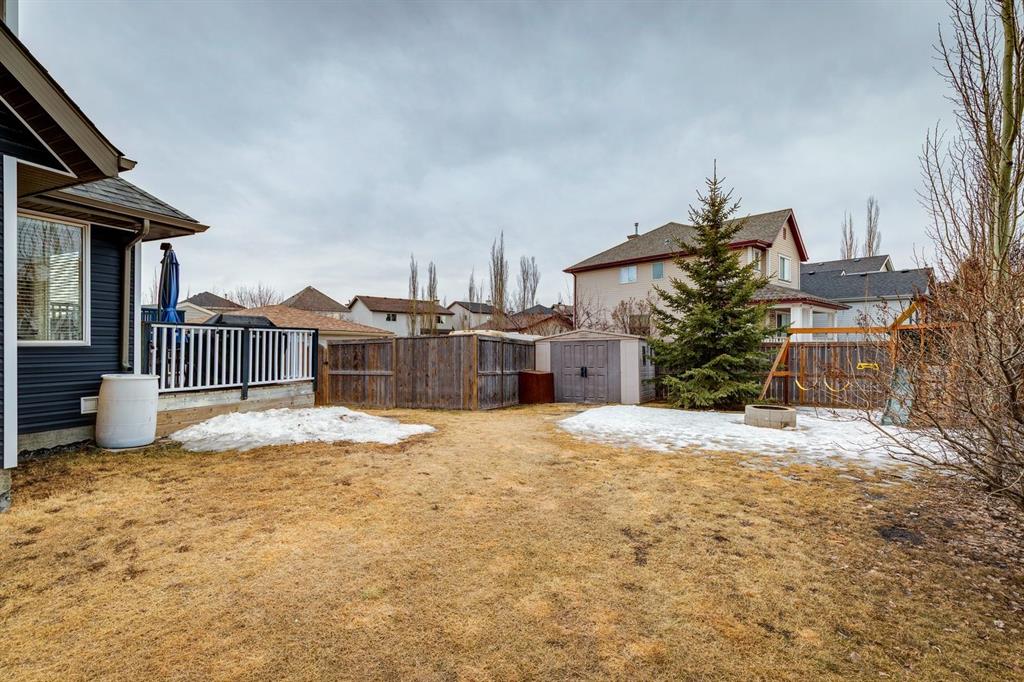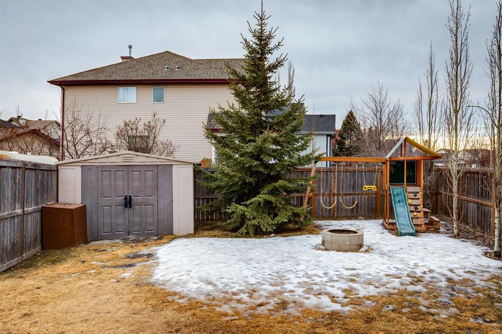 Situated on a large corner lot with sunny south and west exposure, this detached home offers incredible value. Priced below other detached homes in the district, this is the perfect opportunity for a small family starting out, a first-time buyer, or someone ready to upgrade from a townhouse or condo to enjoy more space and freedom. Inside, the open-concept main floor is designed for everyday living and easy entertaining, featuring a fireplace in the living room, and a bright kitchen with a central island, breakfast bar, stainless steel appliances including a brand new stove, and a sink set beneath a window overlooking the backyard. The dining area is especially inviting, wrapped in windows on three sides with warm south-facing sunlight pouring inside. Upstairs offers three bedrooms, including a spacious primary with a walk-in closet and private ensuite, plus a second full bathroom. The undeveloped lower level provides a blank canvas to customize as your needs grow. Outside, the fully fenced south backyard is ready for summer BBQs on the deck, evenings around the fire pit, kids climbing on the swing set and pets roaming freely in the sunshine. Mature trees and a garden shed add privacy and function and there is more than enough space to build a future triple garage, a garden, or expanded outdoor living space. With recently updated siding & roof, the curb appeal is fresh and modern, and the corner lot position offers extra privacy, abundant sunlight, and the added bonus of no sidewalk along that side, meaning less snow shovelling in the winter months. Located in the heart of Copperfield, close to schools, shopping, playgrounds, pathways and ponds, with easy access to Stoney and Deerfoot Trails, this home delivers lifestyle, flexibility, and smart value all in one.